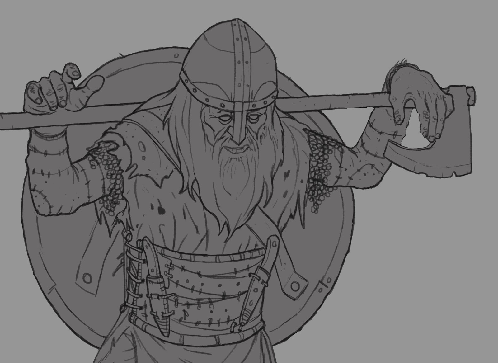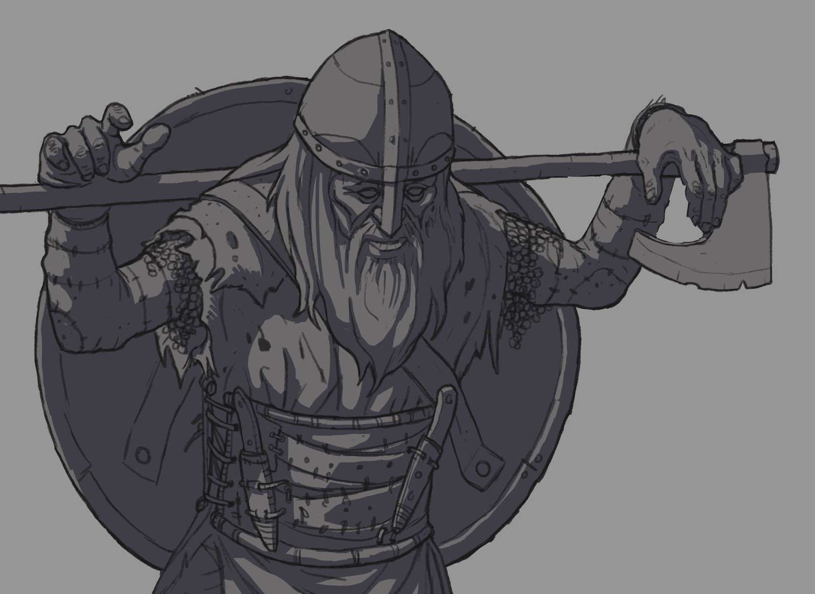 After the sketch is done I like to refine the linework and then add values. Using clipping mask to add the shadows is useful when I want to experiment with different light scenarios.