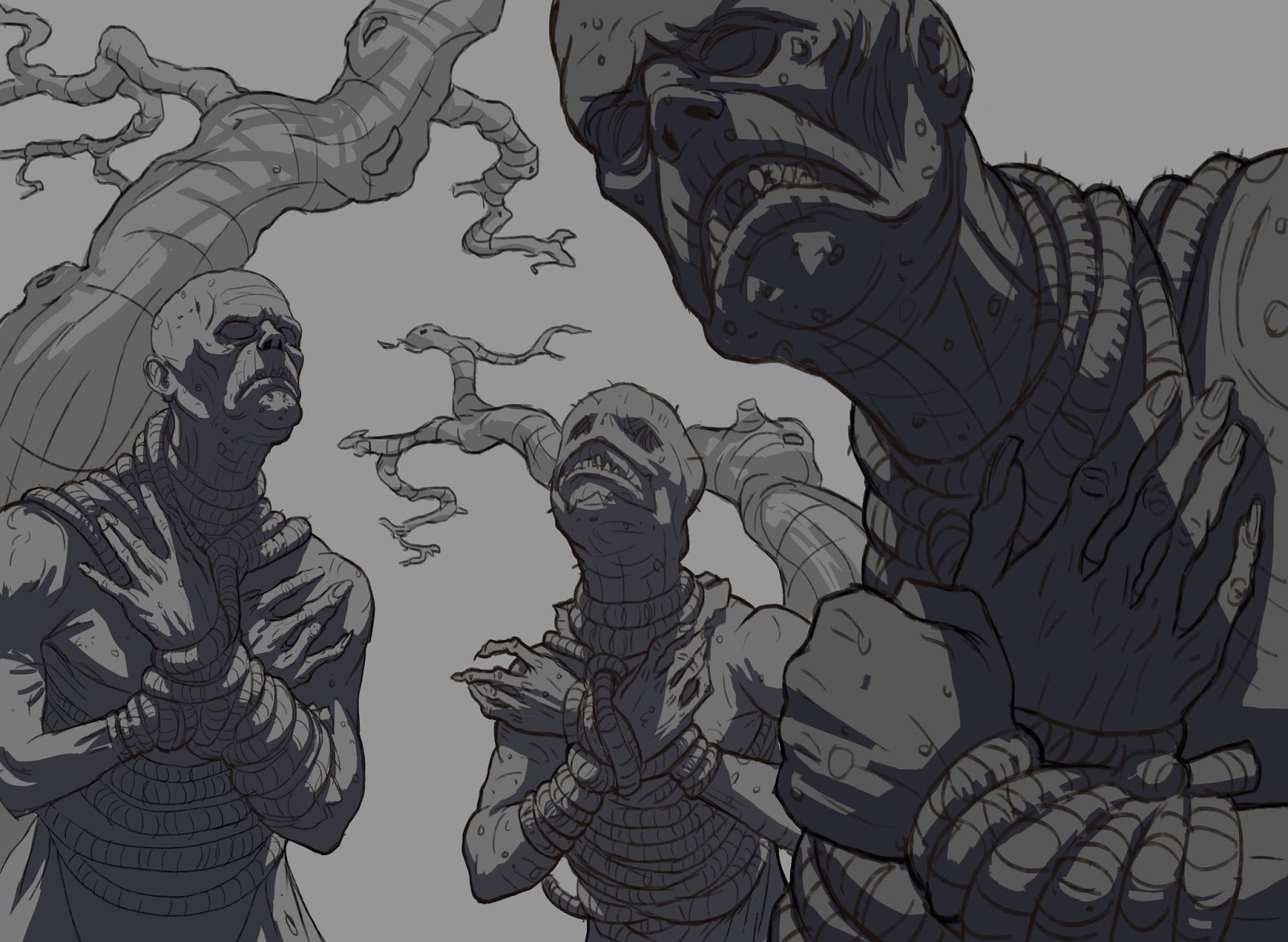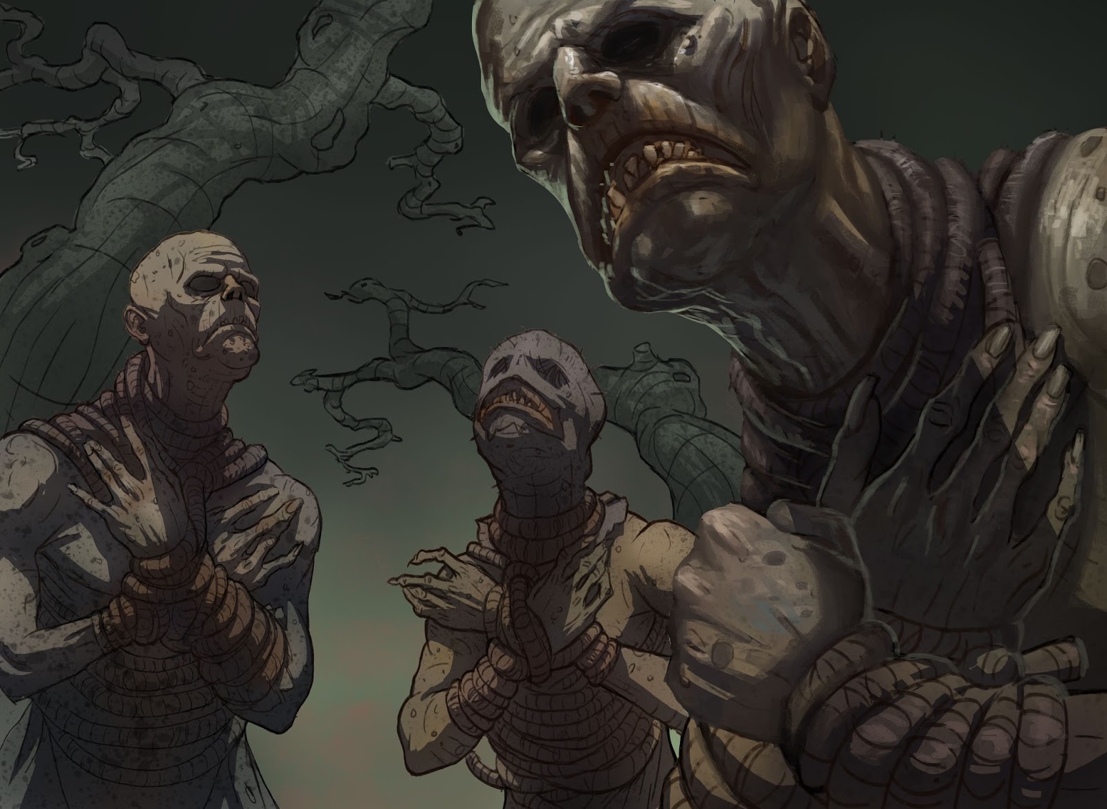 “Bound ones” Final stage. Added brighter green in the back and stronger highlight so the characters got a stronger silhouette. Didn’t focus as much on the characters in the back as I did on the front one.